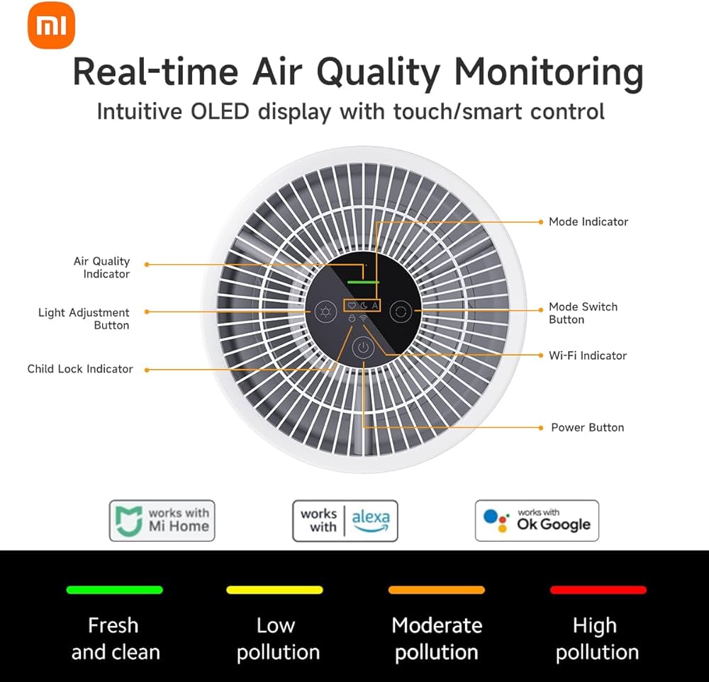 - صفحهنمایش لمسی OLED برای نمایش PM2.5، رنگبندی کیفیت هوا و یادآوری تعویض فیلتر (۶–۱۲ ماه).
